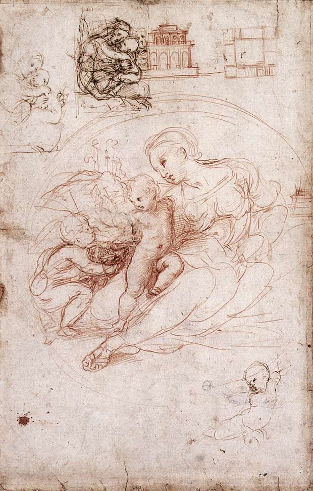 Nous vous proposons une reproduction artisanale sur toile du célèbre tableau 'Études de Madonna' de Raphael, provenant du Musée de la Reproduction.