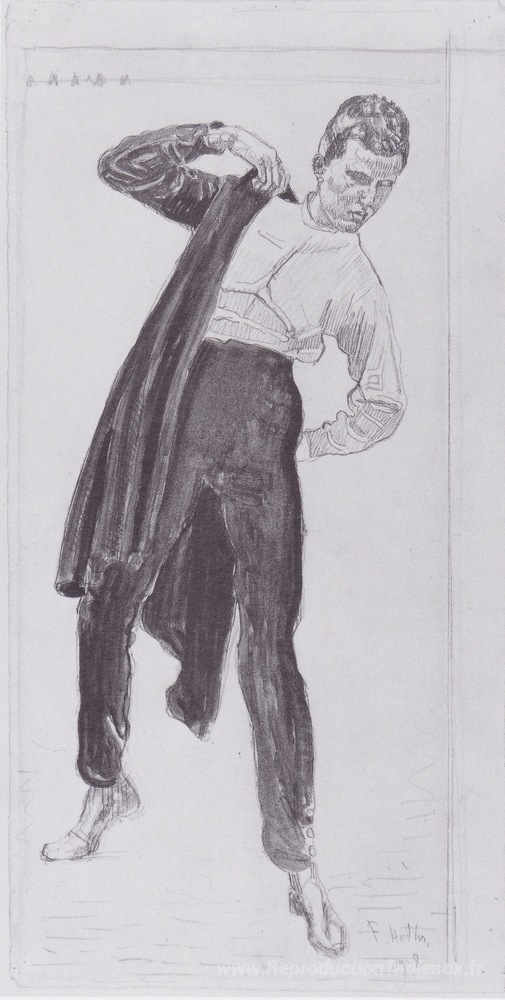 Nous vous proposons une reproduction artisanale sur toile du célèbre tableau 'Étudiant, attrayant sa tunique' de Ferdinand Hodler, provenant du Musée de la Reproduction.