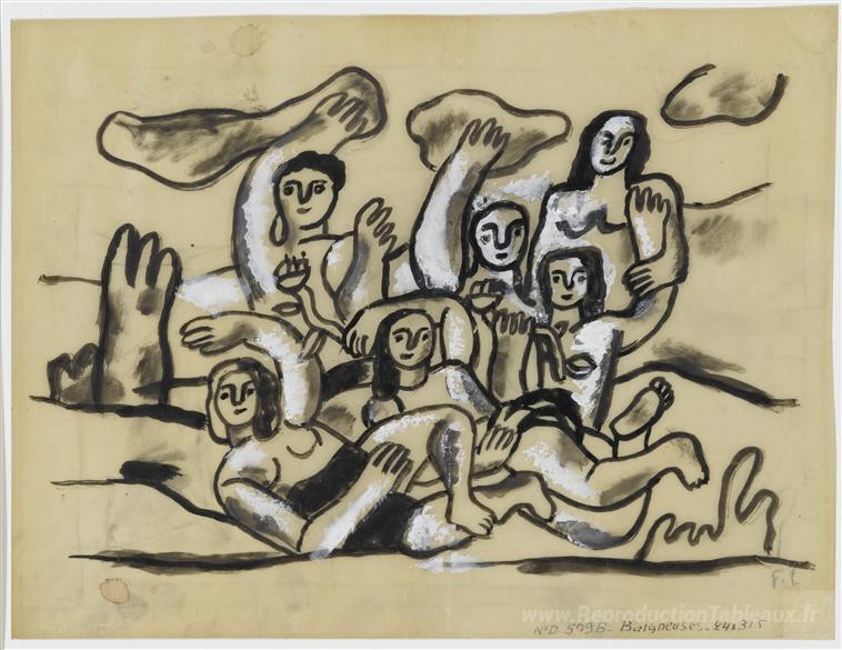 Nous vous proposons une reproduction artisanale sur toile du célèbre tableau 'Étudier pour les baigneurs' de Fernand Leger, provenant du Musée de la Reproduction.