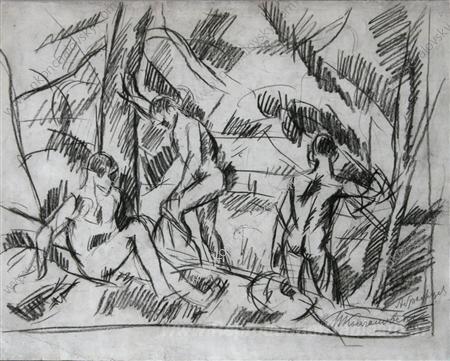 Nous vous proposons une reproduction artisanale sur toile du célèbre tableau 'Abramtsevo. Les garçons de la rivière. Dessin pour la peinture «' de Pyotr Konchalovsky, provenant du Musée de la Reproduction.