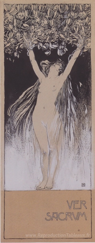 Nous vous proposons une reproduction artisanale sur toile du célèbre tableau 'Allégorie de ver sacrum, croquis de l'illustration à ver sacrum,' de Koloman Moser, provenant du Musée de la Reproduction.