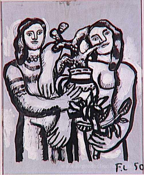 Nous vous proposons une reproduction artisanale sur toile du célèbre tableau 'Anniversaire, deux femmes' de Fernand Leger, provenant du Musée de la Reproduction.