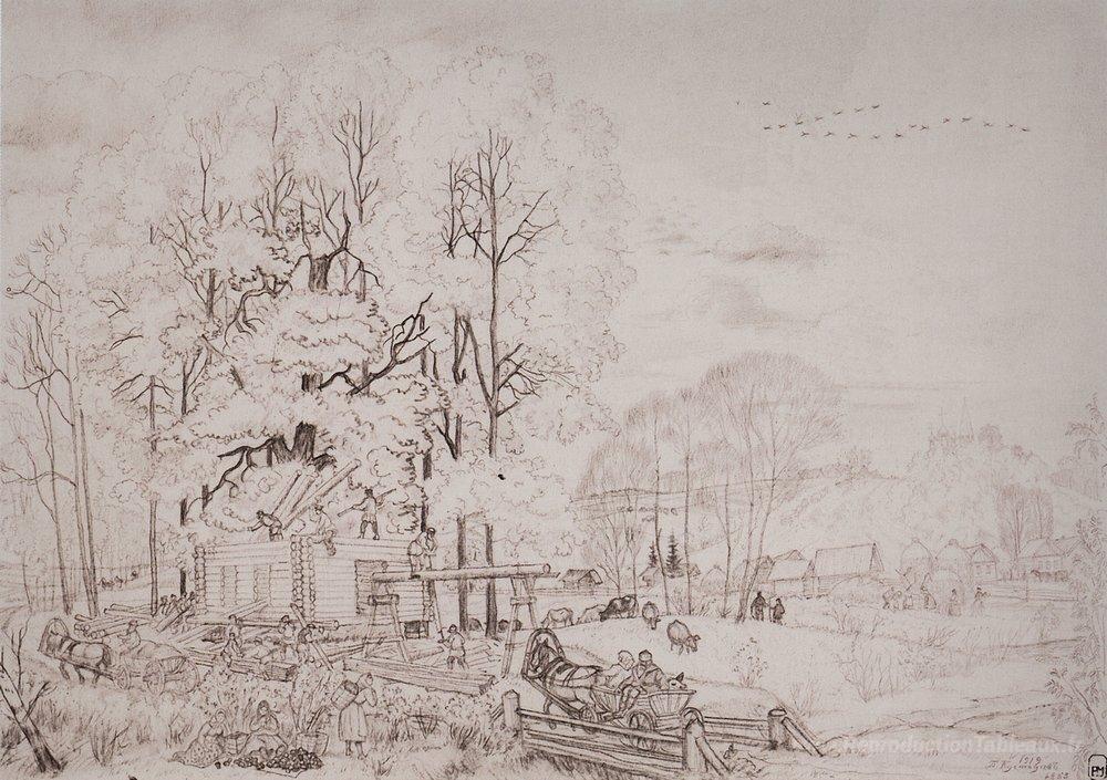 Nous vous proposons une reproduction artisanale sur toile du célèbre tableau 'Automne' de Boris Kustodiev, provenant du Musée de la Reproduction.