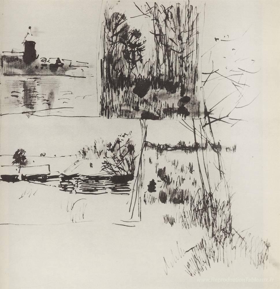 Nous vous proposons une reproduction artisanale sur toile du célèbre tableau 'Bâtiment au bord de l'eau. Au bord du village.' de Isaac Levitan, provenant du Musée de la Reproduction.