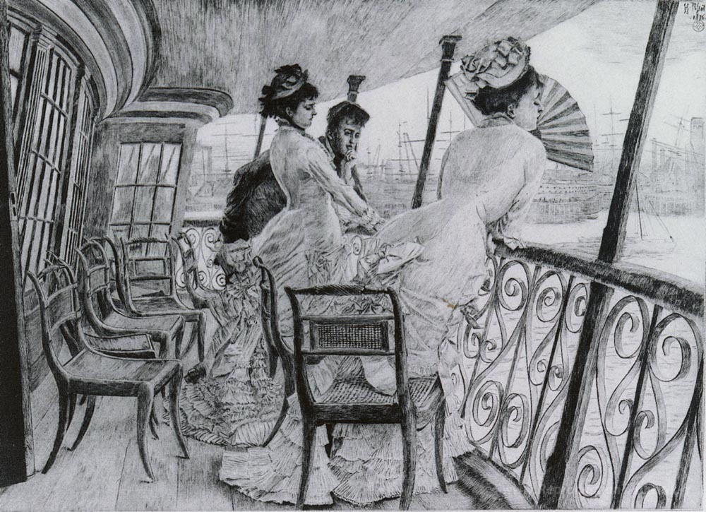 Nous vous proposons une reproduction artisanale sur toile du célèbre tableau 'Ball de souvenir à bord' de James Tissot, provenant du Musée de la Reproduction.