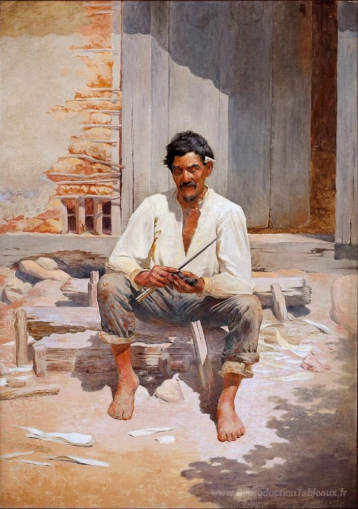 Nous vous proposons une reproduction artisanale sur toile du célèbre tableau 'Caipira haching tabac (croquis)' de Jose Ferraz de Almeida Junior, provenant du Musée de la Reproduction.