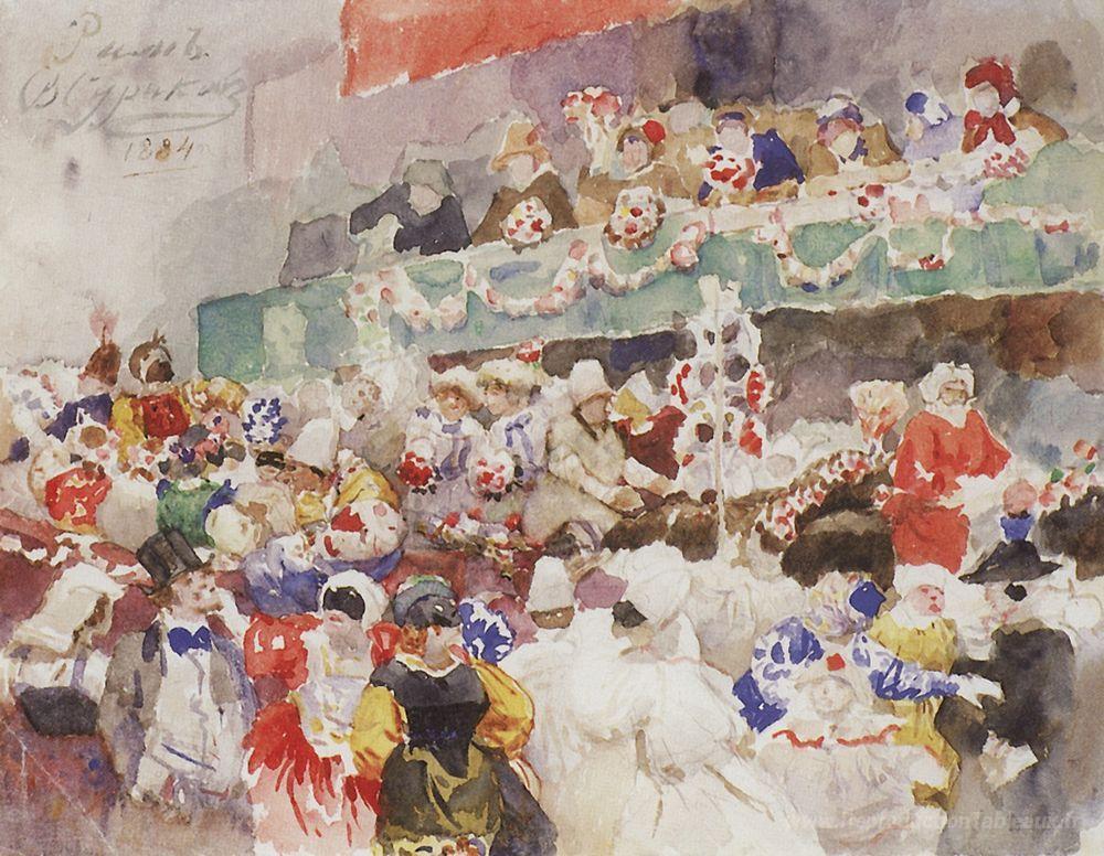 Nous vous proposons une reproduction artisanale sur toile du célèbre tableau 'Carnaval romain' de Vasily Surikov, provenant du Musée de la Reproduction.
