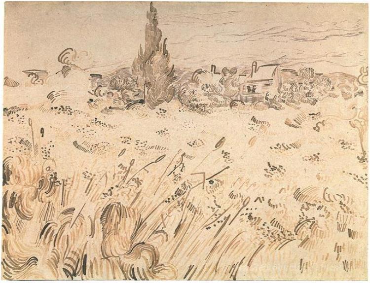 Nous vous proposons une reproduction artisanale sur toile du célèbre tableau 'Champ de blé avec des cyprès' de Vincent van Gogh, provenant du Musée de la Reproduction.