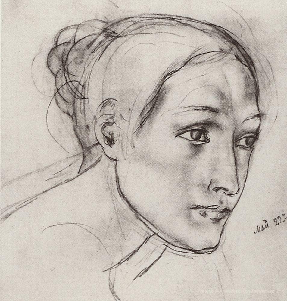 Nous vous proposons une reproduction artisanale sur toile du célèbre tableau 'Chef féminine' de Kuzma Petrov-Vodkin, provenant du Musée de la Reproduction.