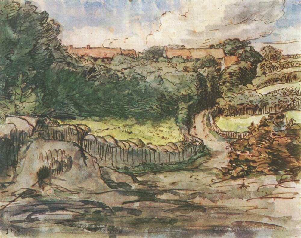 Nous vous proposons une reproduction artisanale sur toile du célèbre tableau 'Cousin de ferme manoir à Greville' de Jean-Francois Millet, provenant du Musée de la Reproduction.