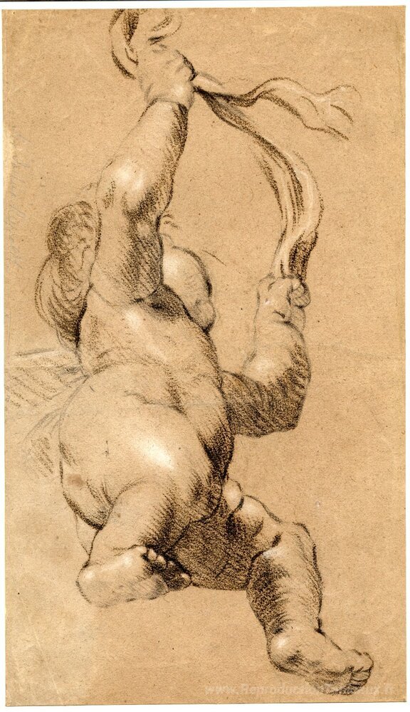 Nous vous proposons une reproduction artisanale sur toile du célèbre tableau 'Croquis de putto tenant une ceinture dans les deux mains, vue d'' de Joshua Reynolds, provenant du Musée de la Reproduction.
