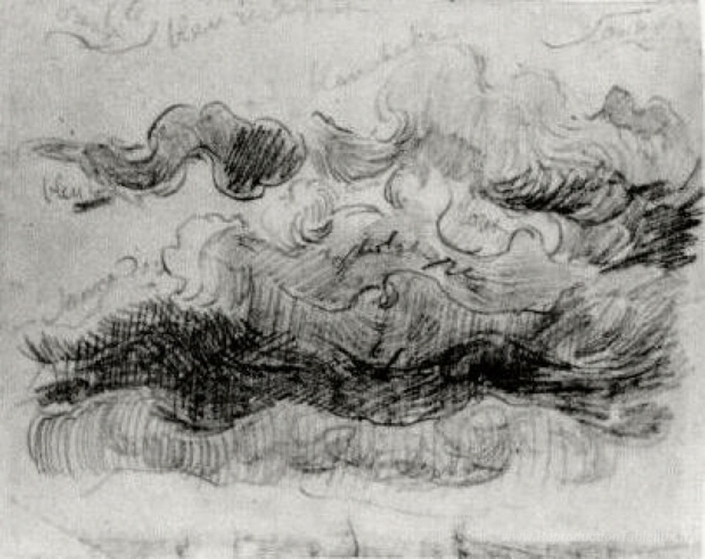Nous vous proposons une reproduction artisanale sur toile du célèbre tableau 'Croquis des nuages avec des annotations de couleur' de Vincent van Gogh, provenant du Musée de la Reproduction.