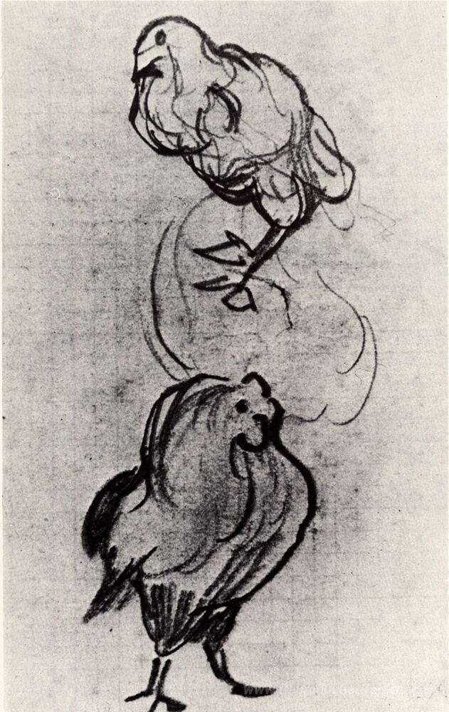 Nous vous proposons une reproduction artisanale sur toile du célèbre tableau 'Croquis d'une poule et d'une bite' de Vincent van Gogh, provenant du Musée de la Reproduction.