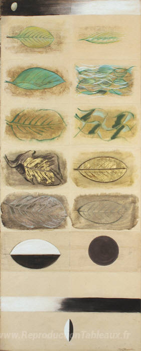 Nous vous proposons une reproduction artisanale sur toile du célèbre tableau 'Cycle de vie d'une feuille' de Morris Graves, provenant du Musée de la Reproduction.