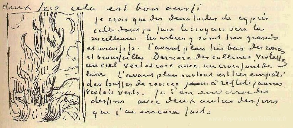 Nous vous proposons une reproduction artisanale sur toile du célèbre tableau 'Cyprès' de Vincent van Gogh, provenant du Musée de la Reproduction.