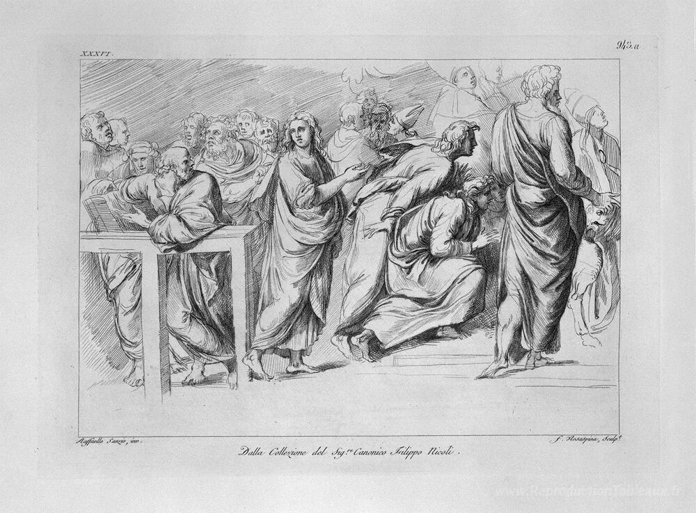 Nous vous proposons une reproduction artisanale sur toile du célèbre tableau 'Détail du différend du sacrement de Raphael' de Giovanni Battista Piranesi, provenant du Musée de la Reproduction.