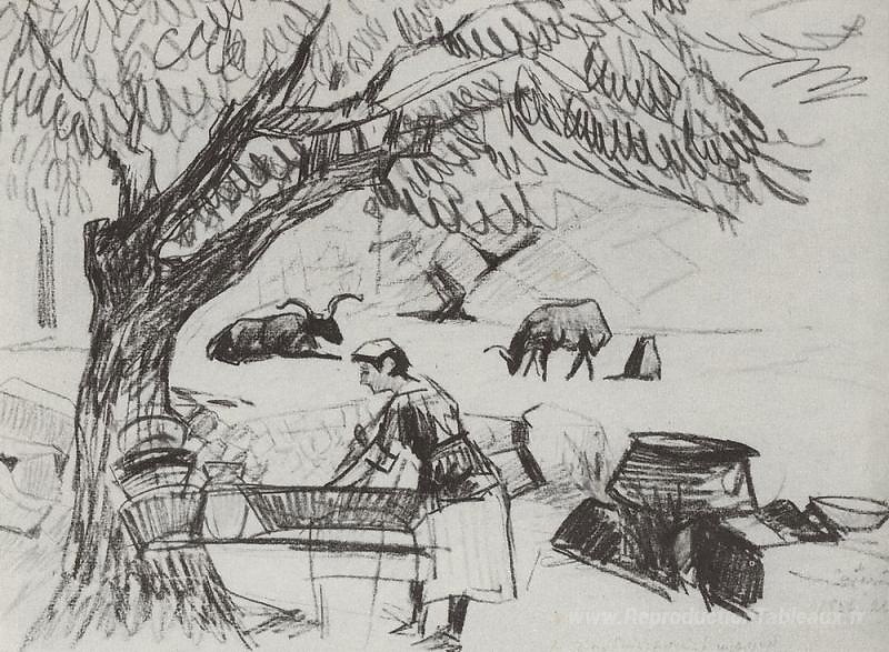 Nous vous proposons une reproduction artisanale sur toile du célèbre tableau 'Dans le jardin' de Martiros Saryan, provenant du Musée de la Reproduction.