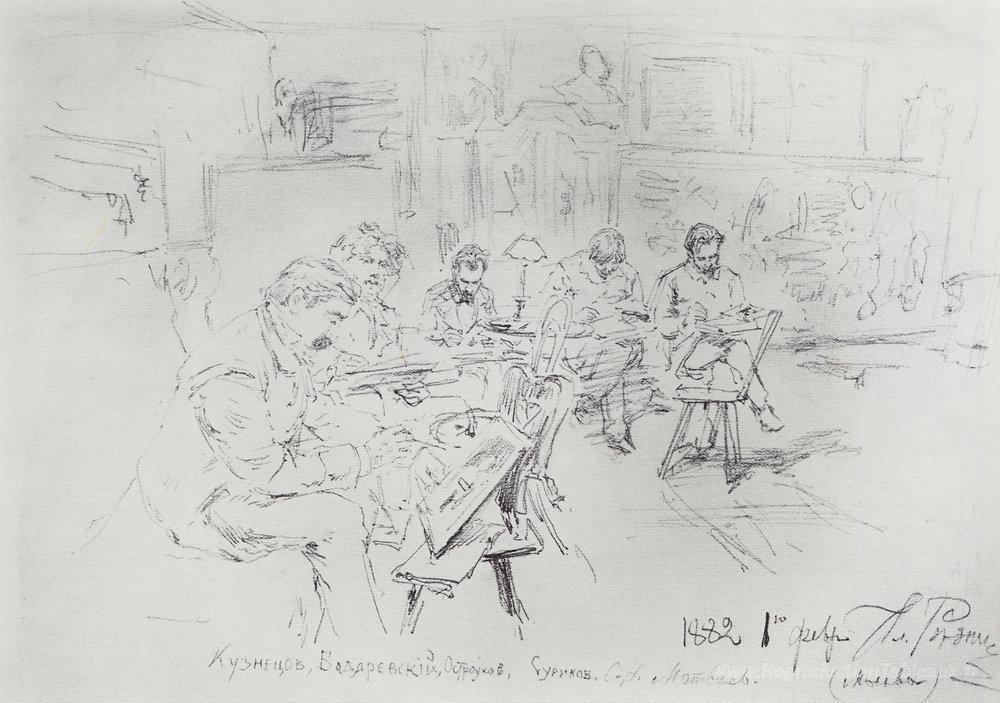 Nous vous proposons une reproduction artisanale sur toile du célèbre tableau 'Dans Repins Studio. Soirée de dessin.' de Ilya Repin, provenant du Musée de la Reproduction.