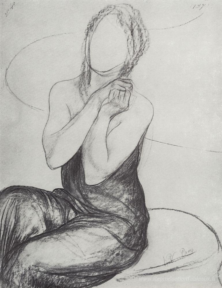 Nous vous proposons une reproduction artisanale sur toile du célèbre tableau 'Dessiner une image de la sorcière' de Kuzma Petrov-Vodkin, provenant du Musée de la Reproduction.