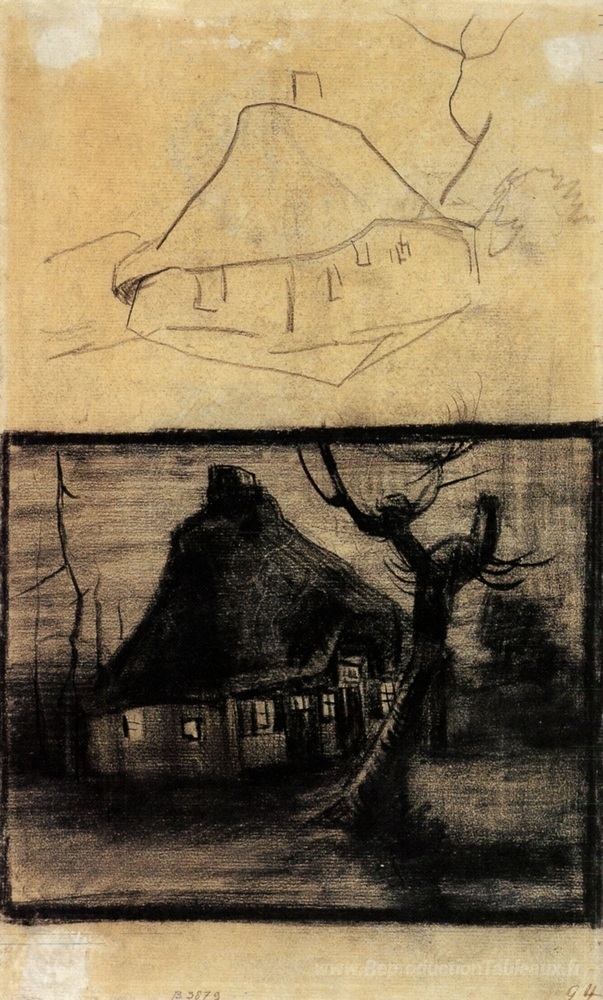 Nous vous proposons une reproduction artisanale sur toile du célèbre tableau 'Deux études sur un chalet' de Vincent van Gogh, provenant du Musée de la Reproduction.