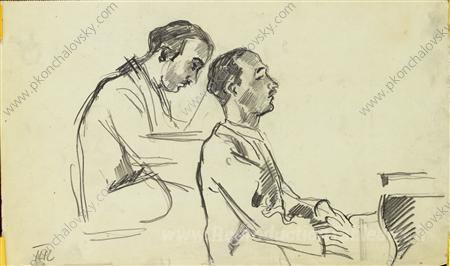 Nous vous proposons une reproduction artisanale sur toile du célèbre tableau 'Deux croquis du pianiste italien Carlo Tsekki au piano pour un p' de Pyotr Konchalovsky, provenant du Musée de la Reproduction.