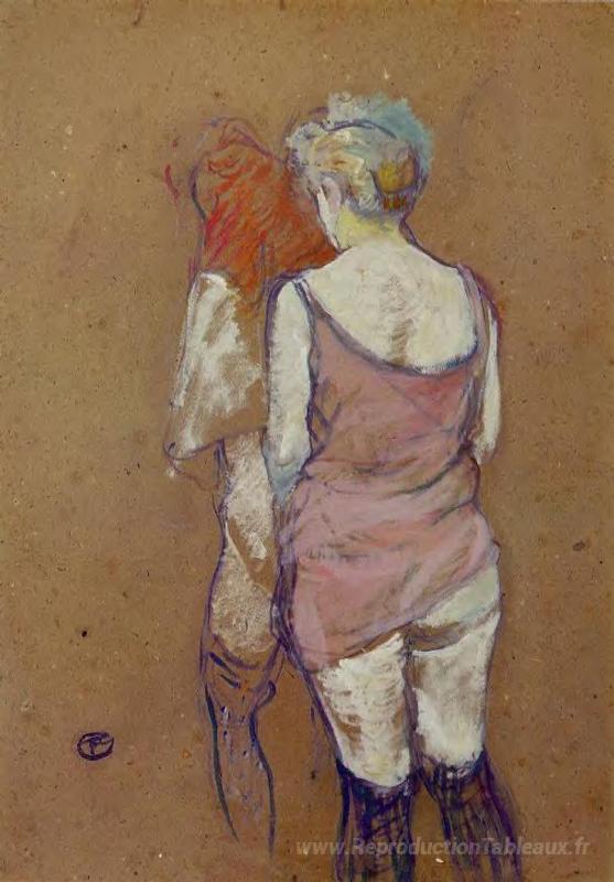 Nous vous proposons une reproduction artisanale sur toile du célèbre tableau 'Deux femmes à moitié nues vues par derrière dans la rue des Moul' de Henri de Toulouse-Lautrec, provenant du Musée de la Reproduction.