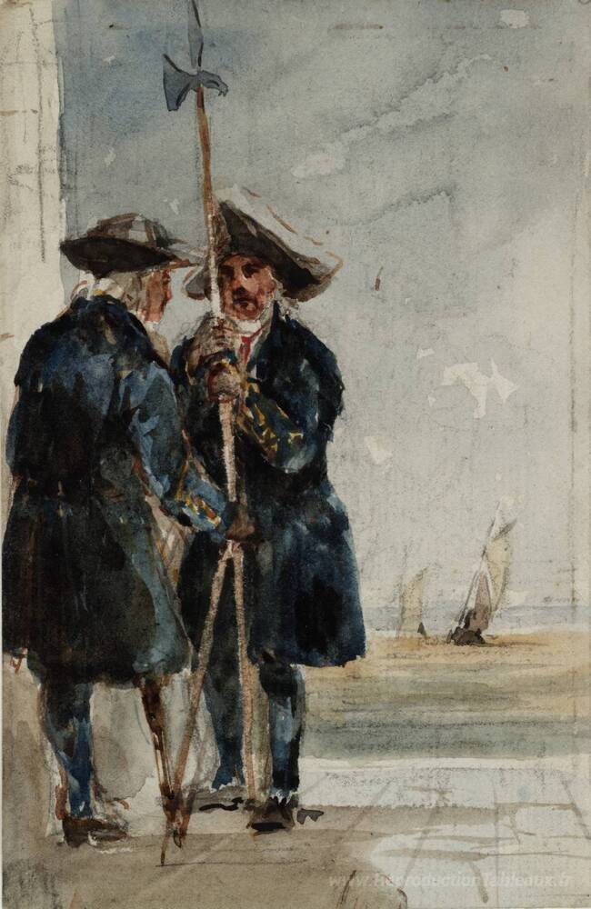 Nous vous proposons une reproduction artisanale sur toile du célèbre tableau 'Deux retraités navals avec expédition derrière' de David Cox, provenant du Musée de la Reproduction.