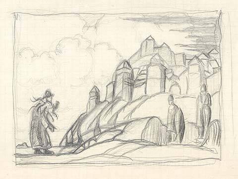 Nous vous proposons une reproduction artisanale sur toile du célèbre tableau 'Esquisse avec une femme devant les murs de la ville' de Nicholas Roerich, provenant du Musée de la Reproduction.