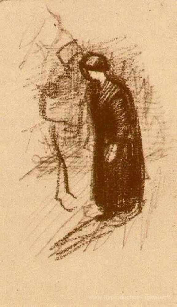 Nous vous proposons une reproduction artisanale sur toile du célèbre tableau 'Femme en robe sombre, marche' de Vincent van Gogh, provenant du Musée de la Reproduction.