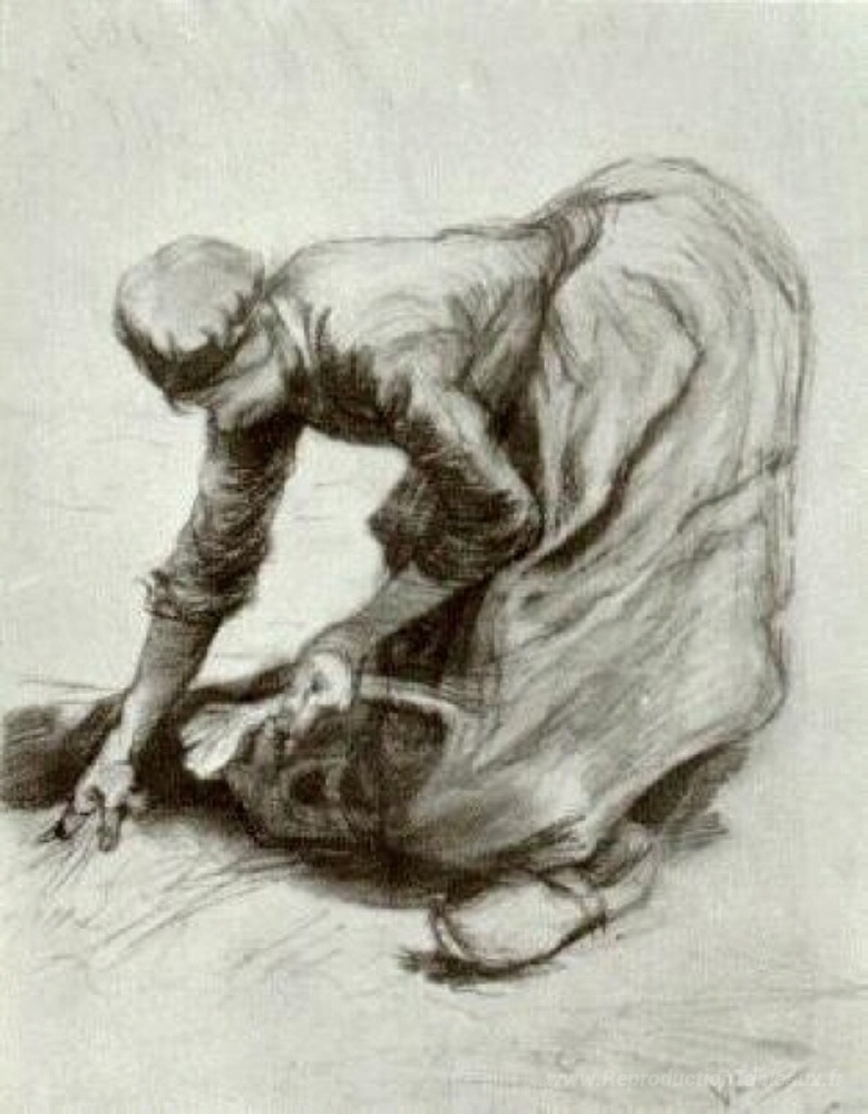 Nous vous proposons une reproduction artisanale sur toile du célèbre tableau 'Femme paysanne, se penchant' de Vincent van Gogh, provenant du Musée de la Reproduction.