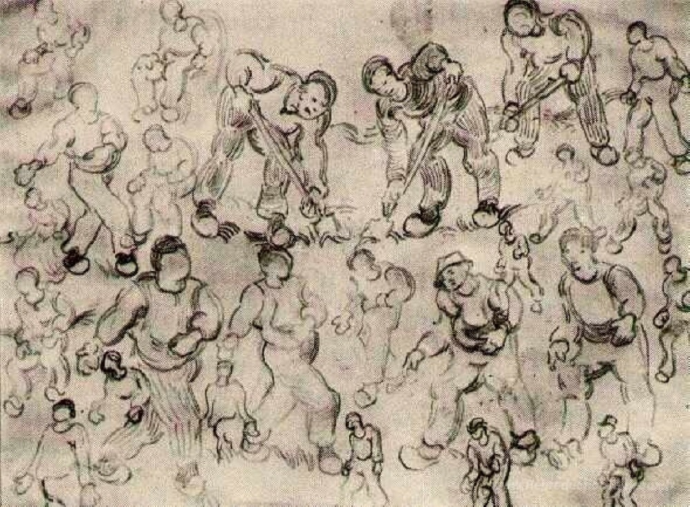 Nous vous proposons une reproduction artisanale sur toile du célèbre tableau 'Feuille avec de nombreux croquis de figures' de Vincent van Gogh, provenant du Musée de la Reproduction.