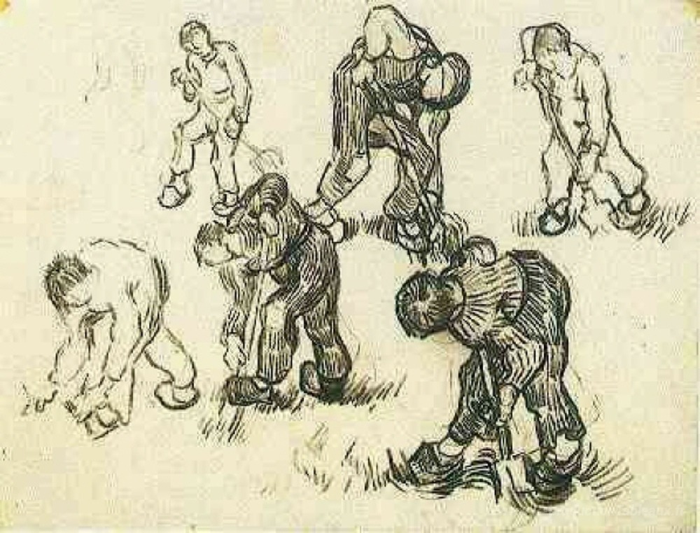 Nous vous proposons une reproduction artisanale sur toile du célèbre tableau 'Feuille avec des croquis de fouilles et autres figures' de Vincent van Gogh, provenant du Musée de la Reproduction.