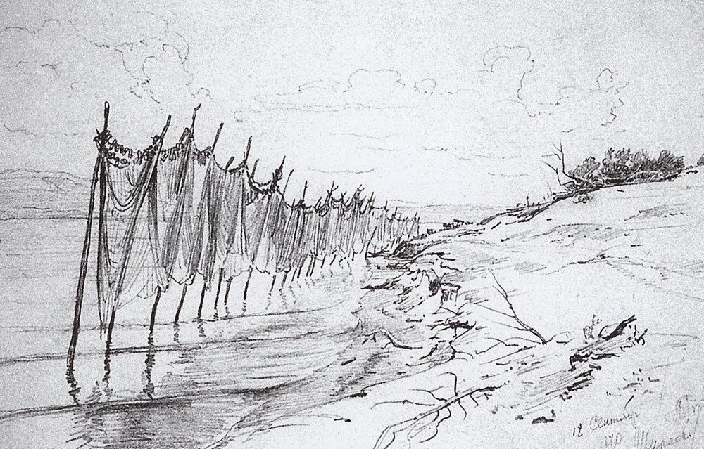 Nous vous proposons une reproduction artisanale sur toile du célèbre tableau 'Filets de pêche. Shiryaevo.' de Ilya Repin, provenant du Musée de la Reproduction.