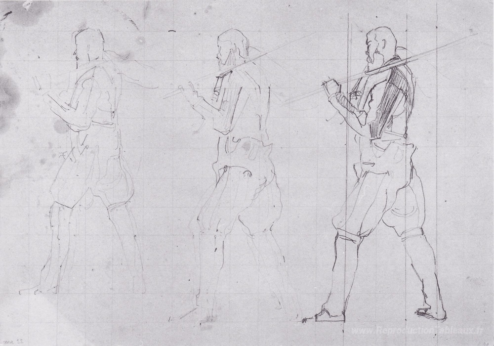 Nous vous proposons une reproduction artisanale sur toile du célèbre tableau 'Guerriers frontaliers de gauche' de Ferdinand Hodler, provenant du Musée de la Reproduction.