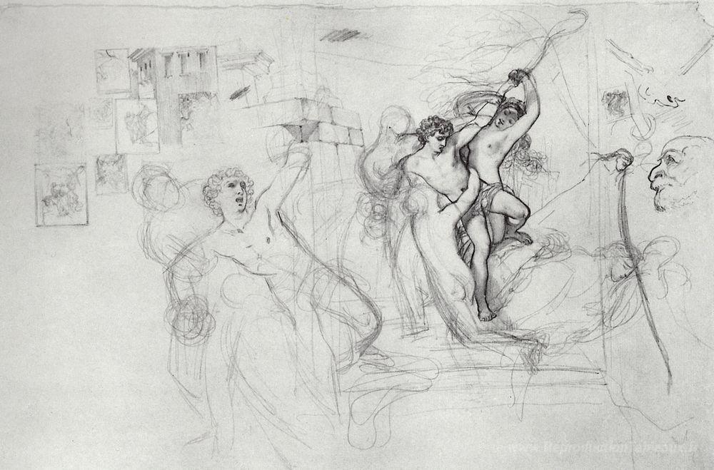 Nous vous proposons une reproduction artisanale sur toile du célèbre tableau 'Hylas, transporté par les nymphes dans l'eau' de Karl Bryullov, provenant du Musée de la Reproduction.