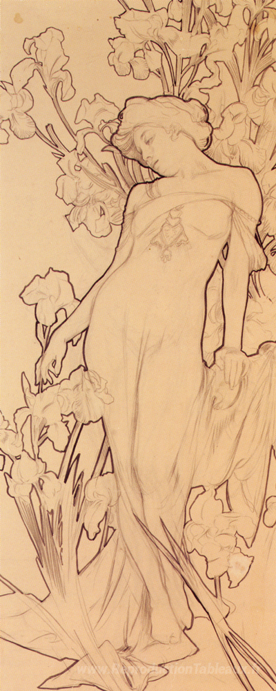 Nous vous proposons une reproduction artisanale sur toile du célèbre tableau 'Iris' de Alphonse Mucha, provenant du Musée de la Reproduction.