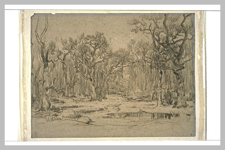 Nous vous proposons une reproduction artisanale sur toile du célèbre tableau 'La forêt en hiver' de Theodore Rousseau, provenant du Musée de la Reproduction.