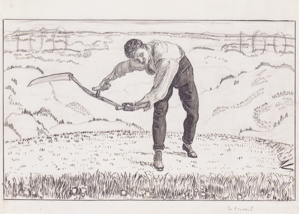 Nous vous proposons une reproduction artisanale sur toile du célèbre tableau 'La tondeuse de travail' de Ferdinand Hodler, provenant du Musée de la Reproduction.