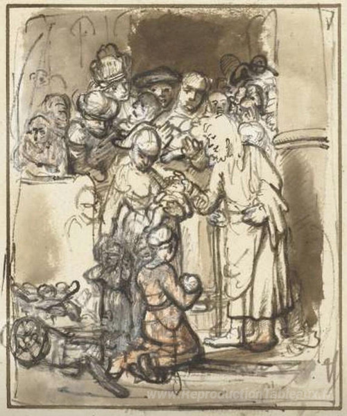Nous vous proposons une reproduction artisanale sur toile du célèbre tableau 'Le Christ bénisse les enfants' de Nicolaes Maes, provenant du Musée de la Reproduction.