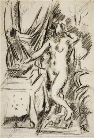 Nous vous proposons une reproduction artisanale sur toile du célèbre tableau 'Le modèle au miroir' de Pyotr Konchalovsky, provenant du Musée de la Reproduction.