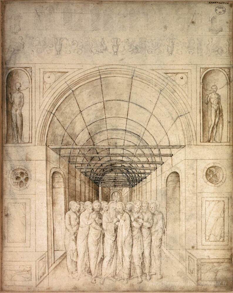 Nous vous proposons une reproduction artisanale sur toile du célèbre tableau 'Les douze apôtres dans un passage voûté en baril' de Jacopo Bellini, provenant du Musée de la Reproduction.