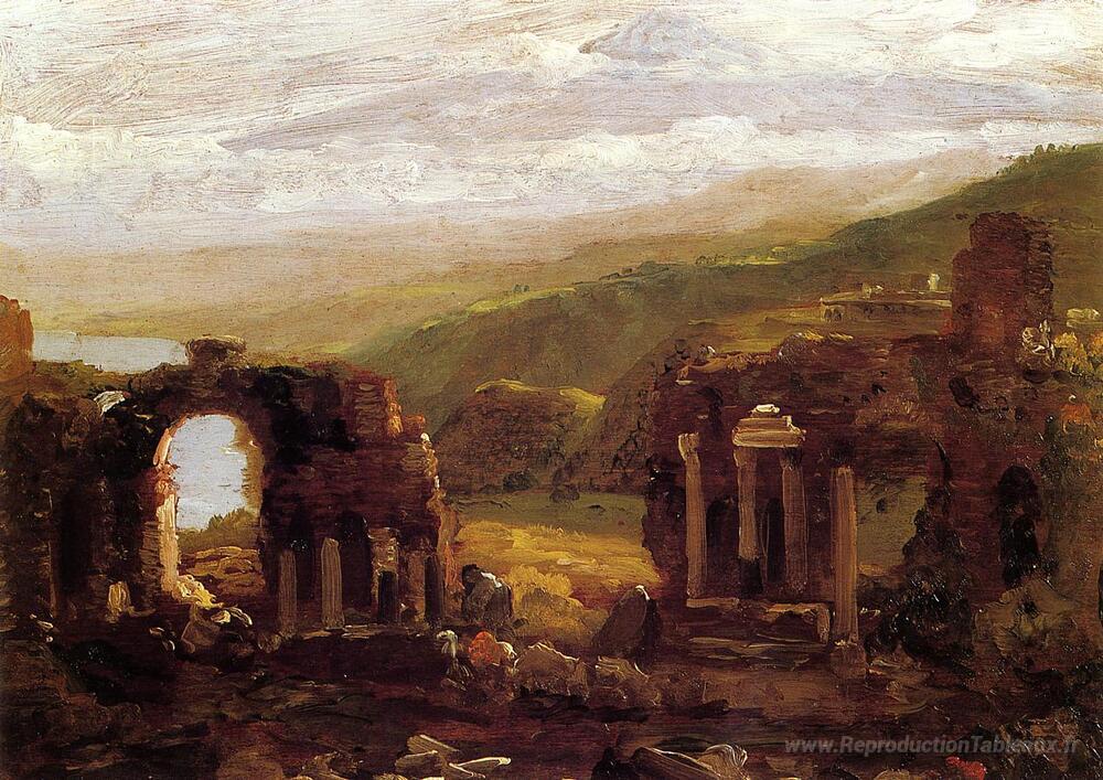 Nous vous proposons une reproduction artisanale sur toile du célèbre tableau 'Les ruines de Taormina' de Thomas Cole, provenant du Musée de la Reproduction.