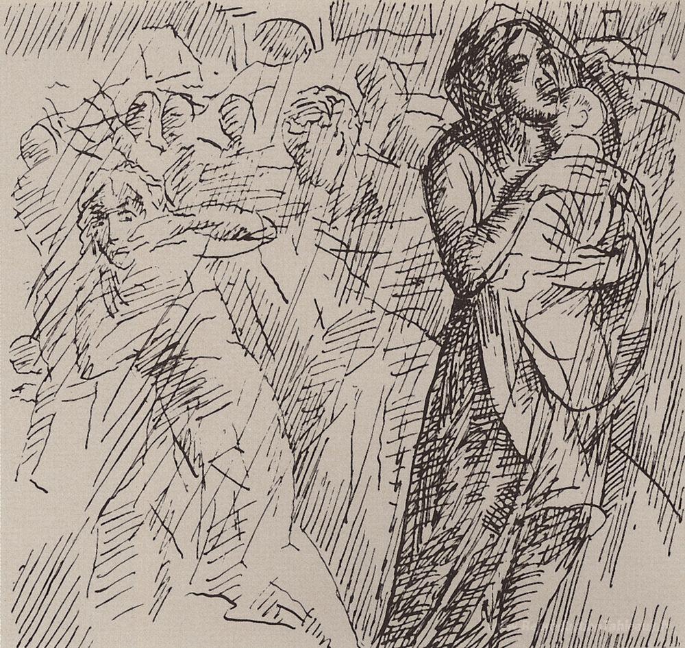Nous vous proposons une reproduction artisanale sur toile du célèbre tableau 'Mère, sauvegarde des enfants' de Kuzma Petrov-Vodkin, provenant du Musée de la Reproduction.