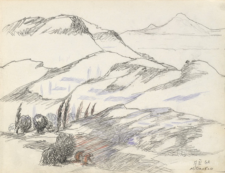 Nous vous proposons une reproduction artisanale sur toile du célèbre tableau 'Montagnes arméniennes' de Martiros Saryan, provenant du Musée de la Reproduction.