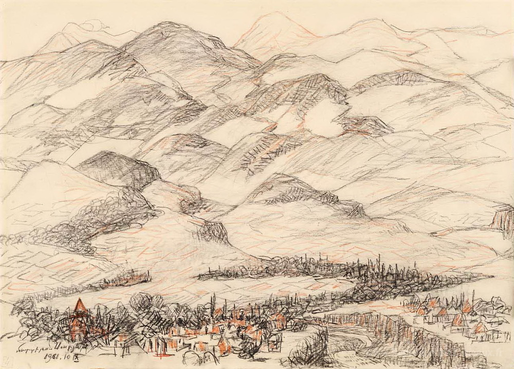 Nous vous proposons une reproduction artisanale sur toile du célèbre tableau 'Montagnes' de Martiros Saryan, provenant du Musée de la Reproduction.