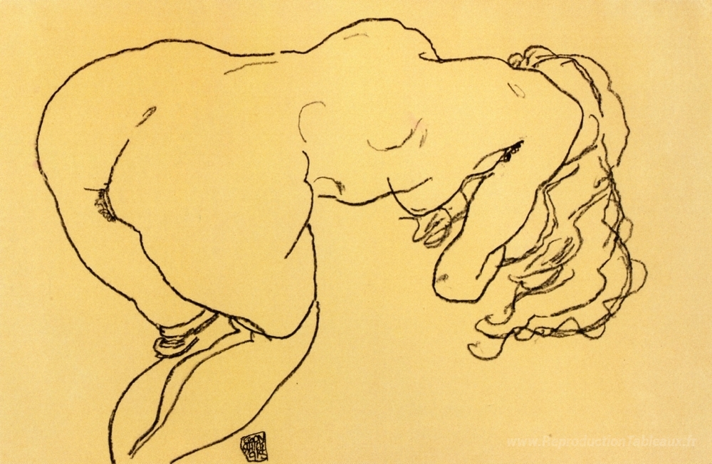 Nous vous proposons une reproduction artisanale sur toile du célèbre tableau 'Nu aux cheveux longs, penché en avant, saccade' de Egon Schiele, provenant du Musée de la Reproduction.