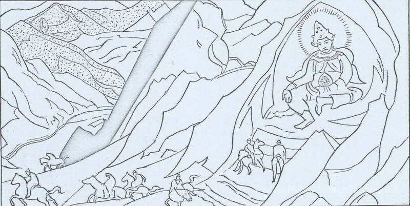 Nous vous proposons une reproduction artisanale sur toile du célèbre tableau 'Ordre de Rigden Jyepo (étude)' de Nicholas Roerich, provenant du Musée de la Reproduction.