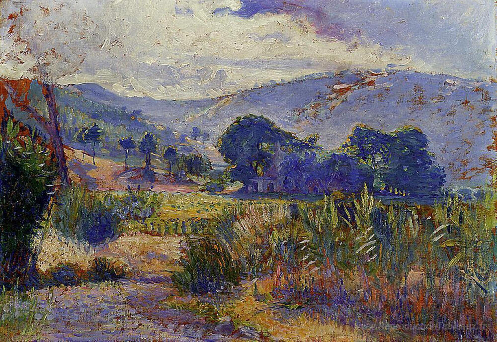 Nous vous proposons une reproduction artisanale sur toile du célèbre tableau 'Paysage de la cabasse (étude)' de Henri-Edmond Cross, provenant du Musée de la Reproduction.