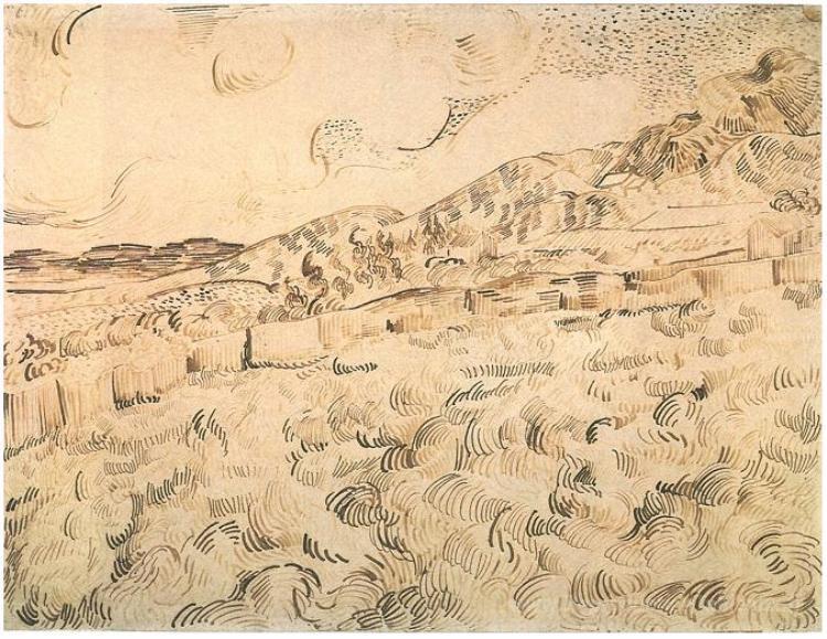 Nous vous proposons une reproduction artisanale sur toile du célèbre tableau 'Paysage de montagne vu à travers les murs' de Vincent van Gogh, provenant du Musée de la Reproduction.