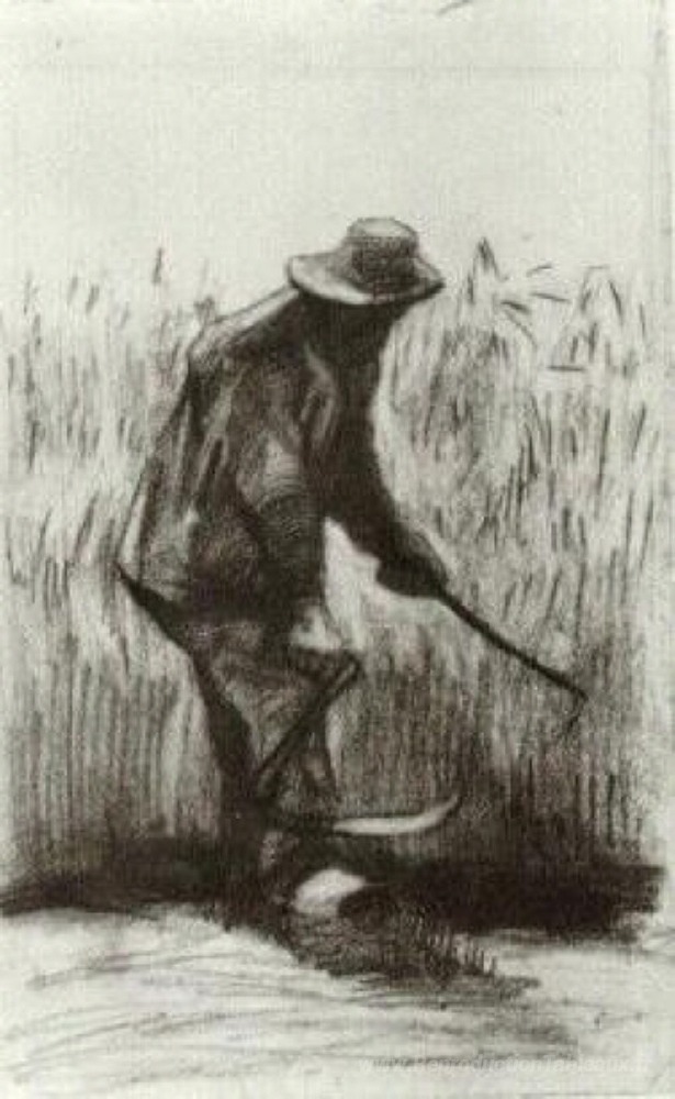 Nous vous proposons une reproduction artisanale sur toile du célèbre tableau 'Paysan avec faucille, vu de l'arrière' de Vincent van Gogh, provenant du Musée de la Reproduction.